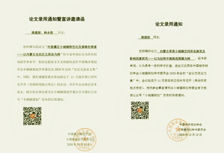 近日,經(jīng)中國城市規(guī)劃學(xué)會、小城鎮(zhèn)規(guī)劃學(xué)術(shù)委員會評審,我院選送的論文《河套灌區(qū)小城鎮(zhèn)特色化發(fā)展路徑探索——以內(nèi)蒙古自治區(qū)五原縣為例》(作者:姚建麗 楊永勝)和《內(nèi)蒙古草原小城鎮(zhèn)空間形態(tài)演變及影響因素研究——以烏拉特中旗海流圖鎮(zhèn)為例》(作者:姚建麗)全文收錄《小城鎮(zhèn)規(guī)劃學(xué)術(shù)委員會 2020 年會會議交流論文集》,其中第一篇論文將在今年11月召開的小城鎮(zhèn)規(guī)劃年會宣讀。