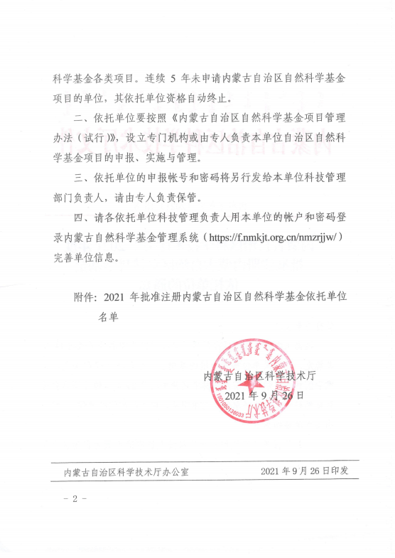近日,內(nèi)蒙古自治區(qū)科學(xué)技術(shù)廳發(fā)布了《關(guān)于2021年度批準(zhǔn)注冊(cè)內(nèi)蒙古自治區(qū)自然科學(xué)基金依托單位的通知》,我院首次被批準(zhǔn)成為內(nèi)蒙古自治區(qū)自然科學(xué)基金依托單位,標(biāo)志著我院具備了獨(dú)自申請(qǐng)和承擔(dān)自治區(qū)自然科學(xué)基金項(xiàng)目的資格。