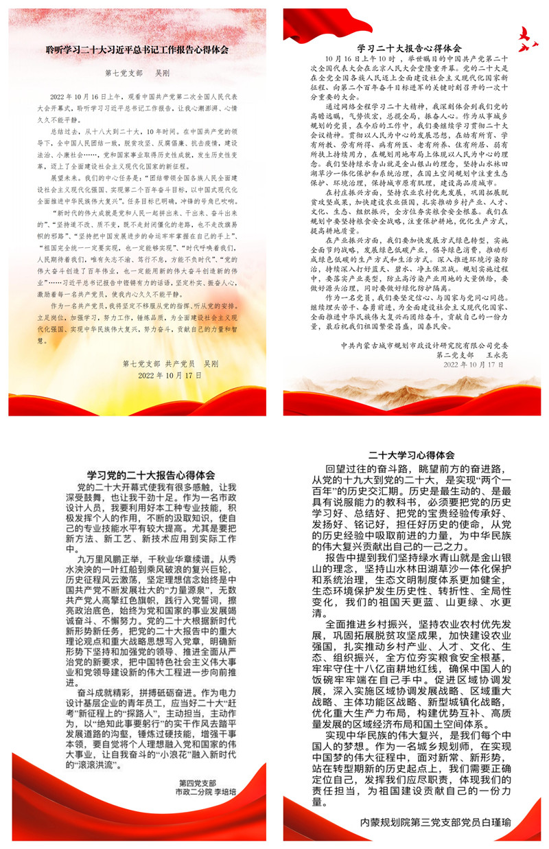 疫情雖然阻擋了大家的腳步,但是阻擋不了各位黨員同志收看的熱情。收聽收看過程中,內(nèi)蒙古規(guī)劃院黨員干部聚精會神地聆聽習(xí)近平總書記重要講話,倍受鼓舞、倍感振奮、倍增信心,不時用筆記下報告中的金句。大家紛紛表示,習(xí)近平總書記所作的大會報告凝聚人心、催人奮進(jìn),尤其是涉及到增進(jìn)民生福祉,提高人民生活品質(zhì)方面,提出的一系列舉措,讓我們對今后的工作和生活更有盼頭;涉及到推動綠色發(fā)展,促進(jìn)人與自然和諧共生,推進(jìn)生態(tài)優(yōu)先、節(jié)約集約、綠色低碳發(fā)展方面,與我們的工作息息相關(guān),作為新時代設(shè)計師,我們要在清潔能源、生態(tài)修復(fù)、低碳建筑等方面大膽創(chuàng)新、銳意進(jìn)取,為建設(shè)亮麗內(nèi)蒙古貢獻(xiàn)專業(yè)力量。我們將以此為契機(jī),學(xué)深悟透習(xí)近平總書記重要講話精神,要繼續(xù)堅定不移跟黨走。作為一名黨員技術(shù)人員,要在做好本職工作的同時,不斷加強學(xué)習(xí),提升專業(yè)技術(shù)能力和科研水平,為推動全院各項工作再上新臺階貢獻(xiàn)力量。