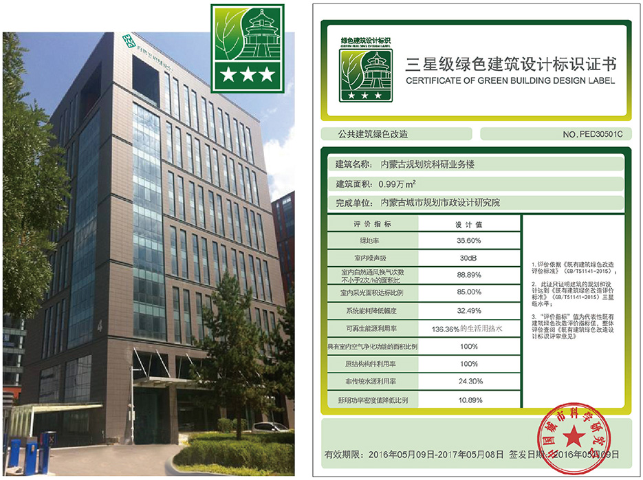 內蒙古規(guī)劃院通過對規(guī)劃與建筑、結構與材料暖通空調、給水排水和電氣等方面進行優(yōu)化設計,使業(yè)務樓改造后達到了既有建筑綠色改造三星級標準。